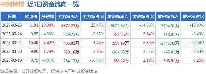 消息,中洲特材3月25日漲停收盤,收盤價11.94元。該股于9點38分漲停,未打開漲停,截止收盤封單資金為8751.3萬元,占其流通市值3.65%。
