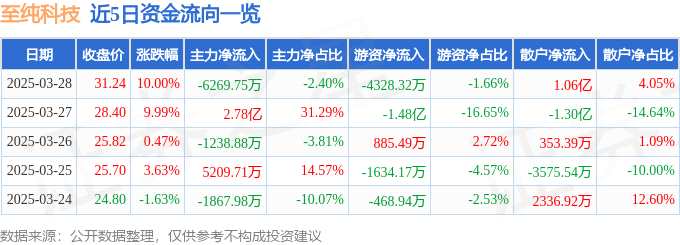消息,至純科技3月28日漲停收盤,收盤價31.24元。該股于9點(diǎn)25分漲停,10次打開漲停,截止收盤封單資金為1.06億元,占其流通市值0.89%。