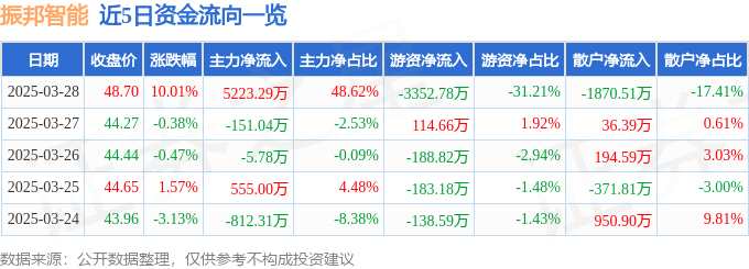 消息,振邦智能3月28日漲停收盤,收盤價48.7元。該股于9點30分漲停,未打開漲停,截止收盤封單資金為4640.49萬元,占其流通市值1.76%。