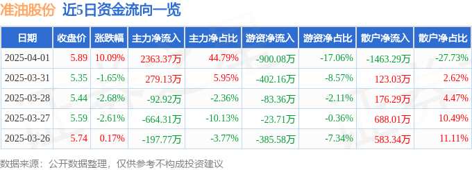 消息,準(zhǔn)油股份4月1日漲停收盤,收盤價(jià)5.89元。該股于9點(diǎn)33分漲停,未打開漲停,截止收盤封單資金為4680.43萬元,占其流通市值3.05%。