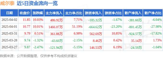 消息,威爾泰4月2日漲停收盤,收盤價(jià)11.85元。該股于9點(diǎn)31分漲停,未打開漲停,截止收盤封單資金為5759.63萬元,占其流通市值3.4%。