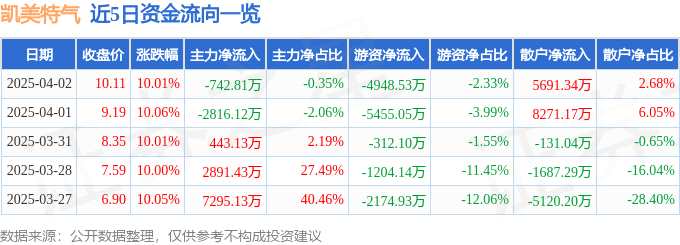 摘要: 消息,凱美特氣4月2日漲停收盤(pán),收盤(pán)價(jià)10.11元。該股于9點(diǎn)25分漲停,5次打開(kāi)漲停,截止收盤(pán)封單資金為6514.44萬(wàn)元,占其流通市值0.93%。4月2日的資金流向數(shù)據(jù)方面,
