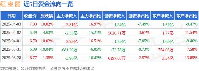 消息,紅 寶 麗4月3日漲停收盤,收盤價(jià)7.03元。該股于14點(diǎn)0分漲停,未打開漲停,截止收盤封單資金為1.79億元,占其流通市值3.49%。