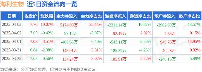 消息,海利生物4月3日漲停收盤,收盤價7.76元。該股于9點48分漲停,未打開漲停,截止收盤封單資金為1947.35萬元,占其流通市值0.39%。