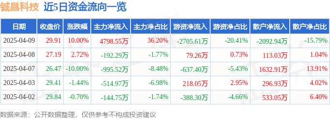 摘要: 消息,鋮昌科技4月9日漲停收盤,收盤價29.91元。該股于9點30分漲停,2次打開漲停,截止收盤封單資金為7205.69萬元,占其流通市值2.38%。4月9日的資金流向數(shù)據(jù)方面,