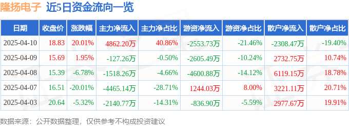 摘要: 消息,隆揚(yáng)電子4月10日漲停收盤,收盤價(jià)18.83元。該股于9點(diǎn)30分漲停,1次打開漲停,截止收盤封單資金為3603.42萬元,占其流通市值2.33%。4月10日的資金流向數(shù)據(jù)方面,