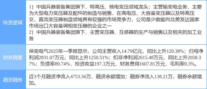 消息,保變電氣4月11日漲停收盤,收盤價8.24元。該股于9點(diǎn)31分漲停,未打開漲停,截止收盤封單資金為8691.61萬元,占其流通市值0.57%。