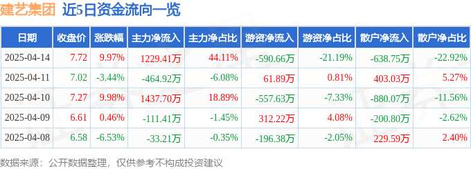 摘要: 消息,建藝集團(tuán)4月14日漲停收盤,收盤價(jià)7.72元。該股于9點(diǎn)25分漲停,未打開漲停,截止收盤封單資金為2964.56萬元,占其流通市值2.92%。4月14日的資金流向數(shù)據(jù)方面,
