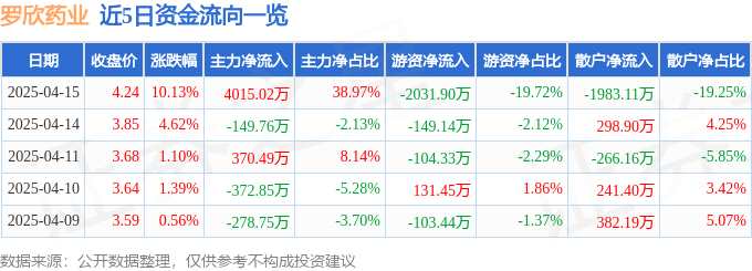 摘要: 消息,羅欣藥業(yè)4月15日漲停收盤(pán),收盤(pán)價(jià)4.24元。該股于9點(diǎn)32分漲停,未打開(kāi)漲停,截止收盤(pán)封單資金為5356.11萬(wàn)元,占其流通市值1.16%。4月15日的資金流向數(shù)據(jù)方面,