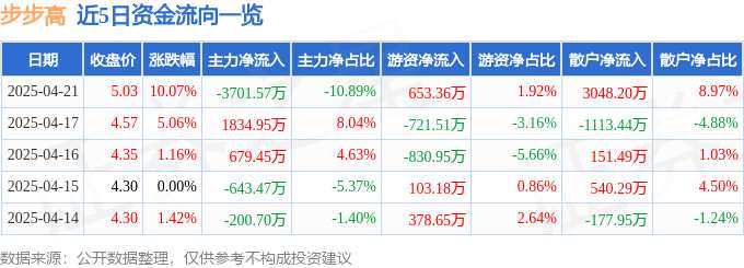 證券之星消息,步步高4月21日漲停收盤,收盤價(jià)5.03元。該股于9點(diǎn)25分漲停,1次打開漲停,截止收盤封單資金為1.41億元,占其流通市值1.85%。
