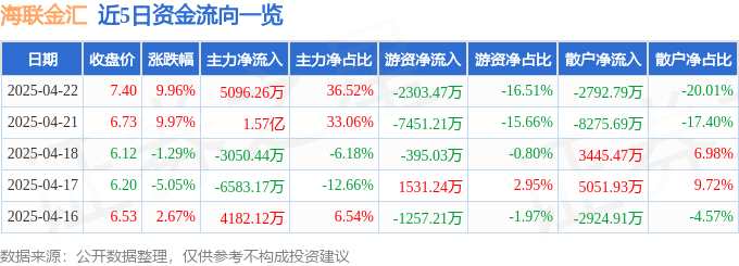 消息,海聯(lián)金匯4月22日漲停收盤,收盤價7.4元。該股于9點25分漲停,未打開漲停,截止收盤封單資金為3.36億元,占其流通市值3.86%。
