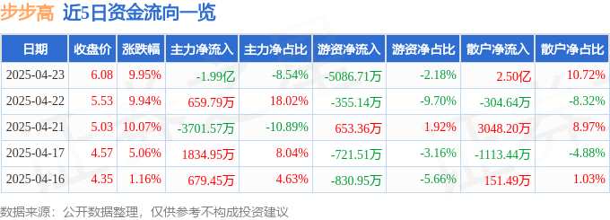 消息,步步高4月23日漲停收盤,收盤價6.08元。該股于9點25分漲停,8次打開漲停,截止收盤封單資金為1.36億元,占其流通市值1.48%。