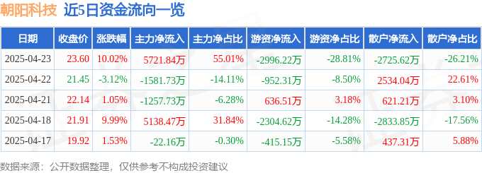 消息,朝陽科技4月23日漲停收盤,收盤價23.6元。該股于9點30分漲停,未打開漲停,截止收盤封單資金為7033.24萬元,占其流通市值2.5%。
