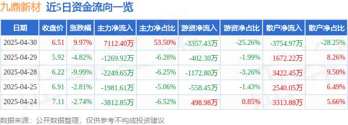消息,九鼎新材4月30日漲停收盤,收盤價6.51元。該股于9點30分漲停,未打開漲停,截止收盤封單資金為8640.15萬元,占其流通市值2.21%。
