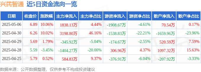 消息,興民智通5月6日漲停收盤,收盤價(jià)6.89元。該股于9點(diǎn)30分漲停,1次打開漲停,截止收盤封單資金為6434.71萬元,占其流通市值1.51%。
