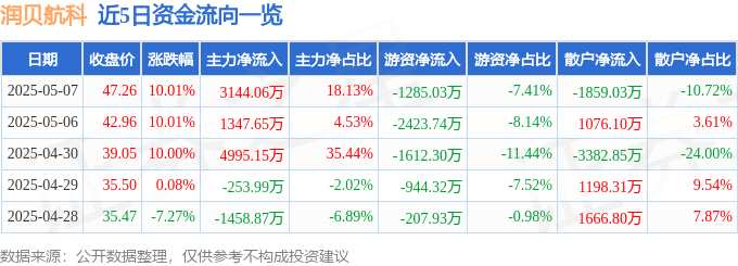 消息,潤貝航科5月7日漲停收盤,收盤價47.26元。該股于9點31分漲停,1次打開漲停,截止收盤封單資金為4406.49萬元,占其流通市值3.43%。