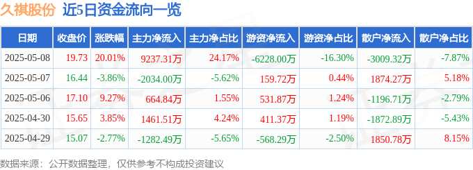 消息,久祺股份5月8日漲停收盤,收盤價(jià)19.73元。該股于9點(diǎn)36分漲停,未打開漲停,截止收盤封單資金為1.59億元,占其流通市值6.91%。