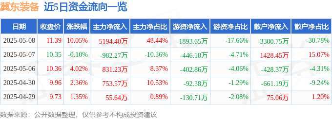 消息,冀東裝備5月8日漲停收盤,收盤價(jià)11.39元。該股于9點(diǎn)32分漲停,未打開(kāi)漲停,截止收盤封單資金為1.02億元,占其流通市值3.94%。
