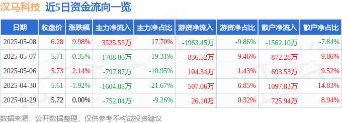 消息,漢馬科技5月8日漲停收盤,收盤價6.28元。該股于9點30分漲停,未打開漲停,截止收盤封單資金為5958.98萬元,占其流通市值0.87%。