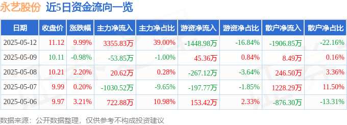 摘要: 消息,永藝股份5月12日漲停收盤,收盤價11.12元。該股于9點32分漲停,未打開漲停,截止收盤封單資金為3877.99萬元,占其流通市值1.16%。5月12日的資金流向數(shù)據(jù)方面,