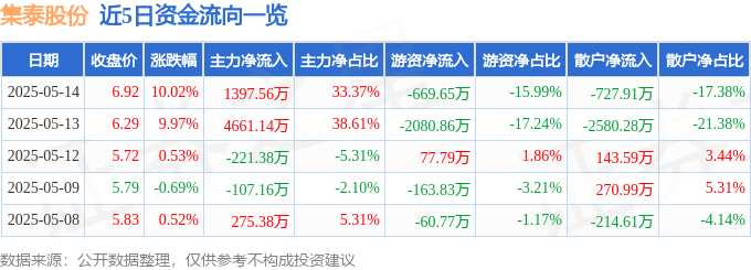 摘要: 消息,集泰股份5月14日漲停收盤,收盤價(jià)6.92元。該股于9點(diǎn)25分漲停,未打開漲停,截止收盤封單資金為1.63億元,占其流通市值6.19%。5月14日的資金流向數(shù)據(jù)方面,
