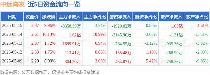 摘要: 消息,中遠(yuǎn)海發(fā)5月15日漲停收盤,收盤價(jià)2.87元。該股于9點(diǎn)33分漲停,67次打開漲停,截止收盤封單資金為6559.16萬元,占其流通市值0.23%。5月15日的資金流向數(shù)據(jù)方面,