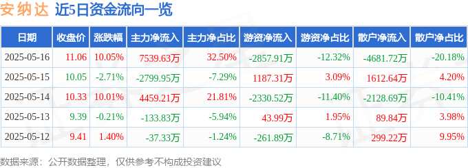 消息,安 納 達(dá)5月16日漲停收盤,收盤價(jià)11.06元。該股于9點(diǎn)44分漲停,未打開漲停,截止收盤封單資金為8478.84萬(wàn)元,占其流通市值3.57%。