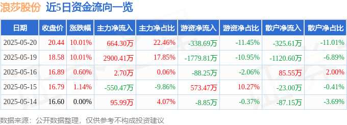 摘要: 消息,浪莎股份5月20日漲停收盤,收盤價20.44元。該股于9點25分漲停,未打開漲停,截止收盤封單資金為3.99億元,占其流通市值20.08%。5月20日的資金流向數(shù)據(jù)方面,