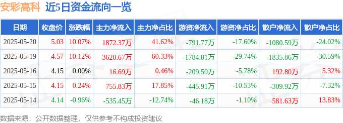 摘要: 消息,安彩高科5月20日漲停收盤,收盤價5.03元。該股于9點25分漲停,未打開漲停,截止收盤封單資金為1.4億元,占其流通市值2.56%。5月20日的資金流向數(shù)據(jù)方面,
