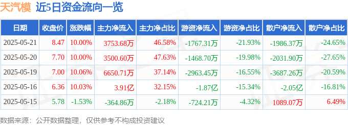 消息,天汽模5月21日漲停收盤,收盤價8.47元。該股于9點25分漲停,未打開漲停,截止收盤封單資金為6.43億元,占其流通市值7.55%。