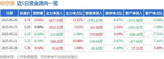 摘要: 消息,哈空調(diào)5月26日漲停收盤,收盤價(jià)5.75元。該股于9點(diǎn)34分漲停,5次打開漲停,截止收盤封單資金為327.92萬(wàn)元,占其流通市值0.15%。5月26日的資金流向數(shù)據(jù)方面,