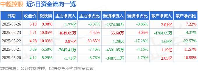 摘要: 消息,中超控股5月26日漲停收盤,收盤價(jià)5.18元。該股于9點(diǎn)32分漲停,4次打開漲停,截止收盤封單資金為1.3億元,占其流通市值1.92%。5月26日的資金流向數(shù)據(jù)方面,主力資金凈流出1.77億元,