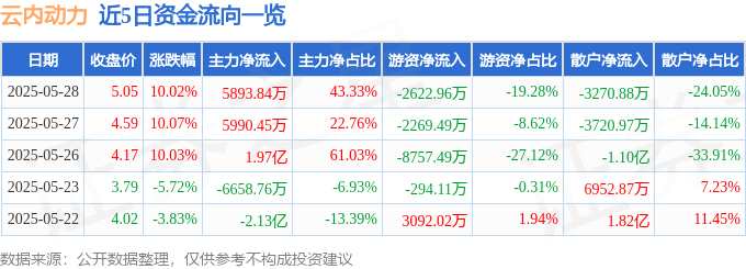 消息,云內(nèi)動(dòng)力5月28日漲停收盤,收盤價(jià)5.05元。該股于9點(diǎn)25分漲停,未打開(kāi)漲停,截止收盤封單資金為3.93億元,占其流通市值4.05%。