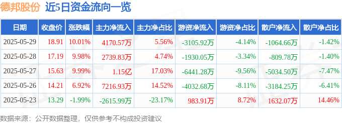 摘要: 消息,德邦股份5月29日漲停收盤,收盤價(jià)18.91元。該股于9點(diǎn)30分漲停,2次打開(kāi)漲停,截止收盤封單資金為2.84億元,占其流通市值1.47%。5月29日的資金流向數(shù)據(jù)方面,