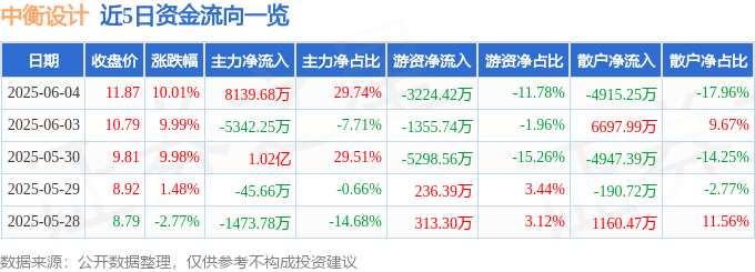 摘要: 消息,中衡設(shè)計(jì)6月4日漲停收盤(pán),收盤(pán)價(jià)11.87元。該股于9點(diǎn)32分漲停,未打開(kāi)漲停,截止收盤(pán)封單資金為8692.38萬(wàn)元,占其流通市值2.65%。6月4日的資金流向數(shù)據(jù)方面,