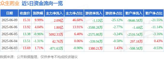 摘要: 消息,眾生藥業(yè)6月9日漲停收盤,收盤價(jià)15.31元。該股于9點(diǎn)30分漲停,未打開(kāi)漲停,截止收盤封單資金為3.28億元,占其流通市值2.82%。6月9日的資金流向數(shù)據(jù)方面,主力資金凈流入2.09億元,