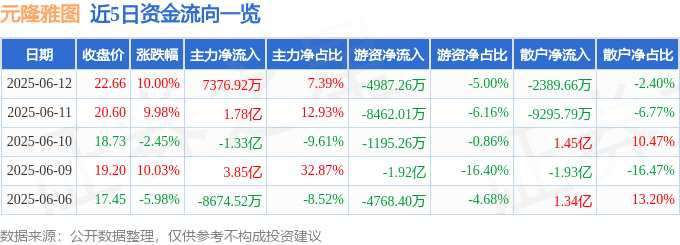 摘要: 消息,元隆雅圖6月12日漲停收盤,收盤價(jià)22.66元。該股于9點(diǎn)34分漲停,1次打開漲停,截止收盤封單資金為1.62億元,占其流通市值3.06%。6月12日的資金流向數(shù)據(jù)方面,