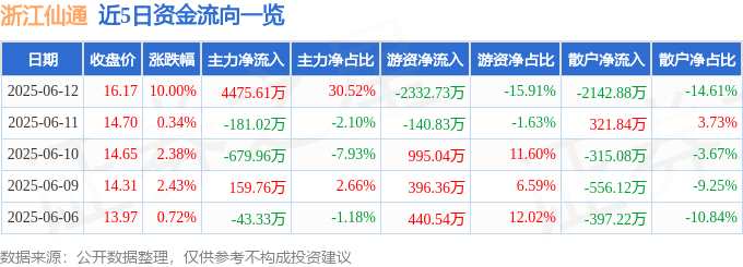 消息,浙江仙通6月12日漲停收盤,收盤價16.17元。該股于9點43分漲停,未打開漲停,截止收盤封單資金為5633.14萬元,占其流通市值1.29%。