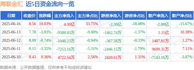 消息,海聯(lián)金匯6月16日漲停收盤,收盤價8.56元。該股于9點32分漲停,1次打開漲停,截止收盤封單資金為1.15億元,占其流通市值1.15%。