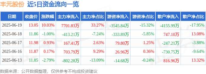 消息,豐元股份6月19日漲停收盤,收盤價13.05元。該股于9點33分漲停,未打開漲停,截止收盤封單資金為5378.3萬元,占其流通市值1.48%。