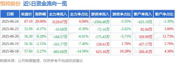 消息,恒帥股份6月24日漲停收盤,收盤價67.19元。該股于9點32分漲停,3次打開漲停,截止收盤封單資金為6138.57萬元,占其流通市值3.01%。