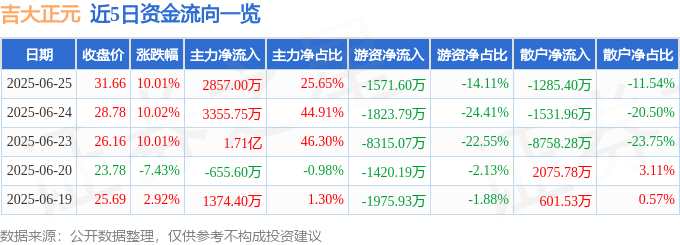 摘要: 消息,吉大正元6月25日漲停收盤,收盤價(jià)31.66元。該股于9點(diǎn)25分漲停,未打開漲停,截止收盤封單資金為2.69億元,占其流通市值4.96%。6月25日的資金流向數(shù)據(jù)方面,