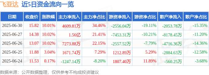 摘要: 消息,飛亞達6月30日漲停收盤,收盤價15.82元。該股于9點30分漲停,未打開漲停,截止收盤封單資金為1.94億元,占其流通市值3.36%。6月30日的資金流向數(shù)據(jù)方面,