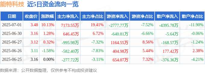 消息,能特科技7月1日漲停收盤,收盤價3.48元。該股于10點34分漲停,未打開漲停,截止收盤封單資金為4584.47萬元,占其流通市值0.57%。