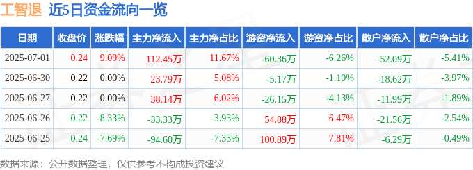 消息,工智退7月1日漲停收盤,收盤價0.24元。該股于9點30分漲停,1次打開漲停,截止收盤封單資金為73.95萬元,占其流通市值0.41%。