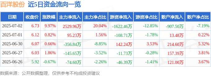 消息,百洋股份7月2日漲停收盤,收盤價6.73元。該股于9點33分漲停,未打開漲停,截止收盤封單資金為7192.48萬元,占其流通市值3.19%。