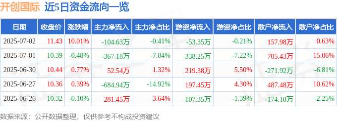 消息,開創(chuàng)國際7月2日漲停收盤,收盤價11.43元。該股于9點30分漲停,1次打開漲停,截止收盤封單資金為5901.54萬元,占其流通市值2.14%。