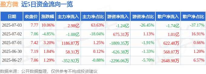 消息,盈方微7月3日漲停收盤,收盤價(jià)7.77元。該股于9點(diǎn)31分漲停,未打開漲停,截止收盤封單資金為1.08億元,占其流通市值1.93%。