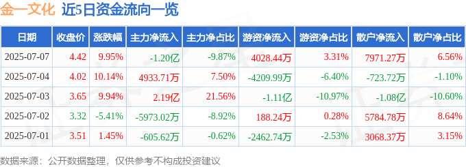 消息,金一文化7月7日漲停收盤,收盤價4.42元。該股于9點33分漲停,未打開漲停,截止收盤封單資金為1.72億元,占其流通市值1.46%。