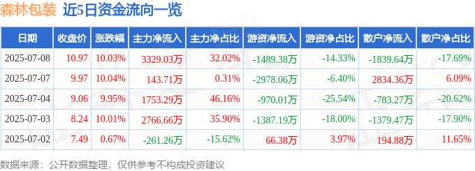 摘要: 消息,森林包裝7月8日漲停收盤,收盤價(jià)10.97元。該股于9點(diǎn)25分漲停,未打開漲停,截止收盤封單資金為1.56億元,占其流通市值3.44%。7月8日的資金流向數(shù)據(jù)方面,